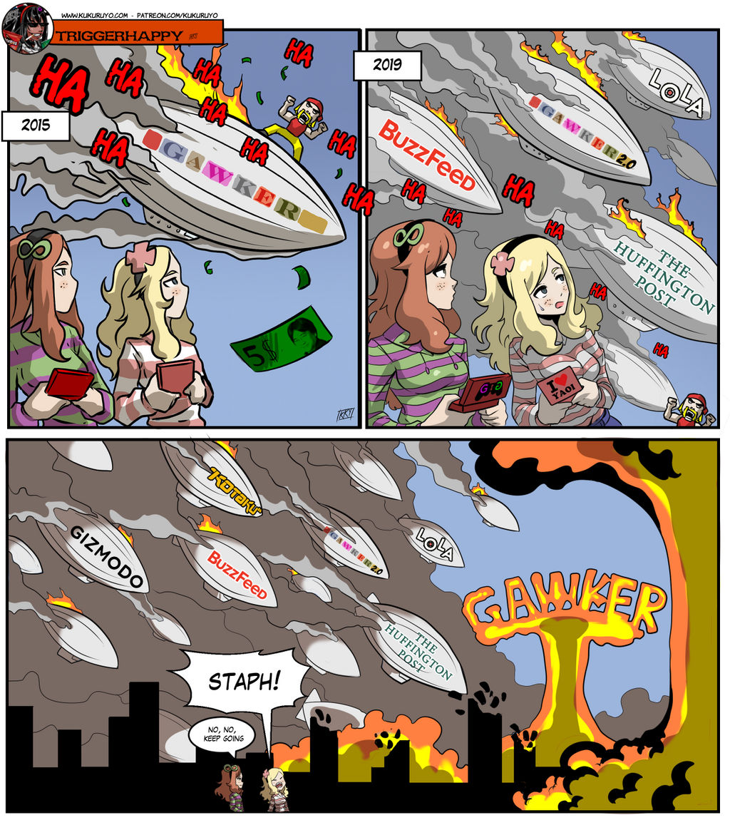 But this? This is some S-tier Schadenfreude. This here is confirmation that "Get Woke, Go Broke" is exactly how Social Justice ruins enterprises. Seeing the writing on the wall, artist Kukuruyo made this new version of his classic cartoon made in celebration of Gawker's demise.