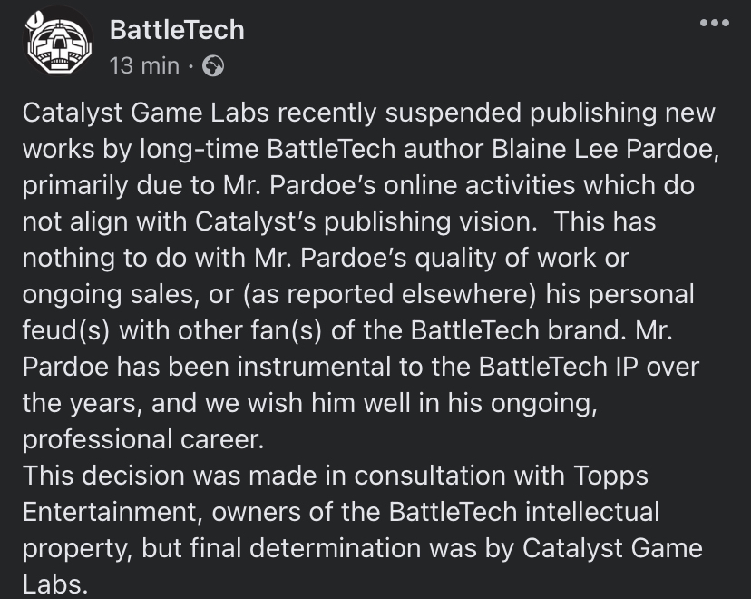 BattleTech, along with all other CGL-held properties, are now Free and Fair Game. A Letter of Marque & Reprisal has been handed to Captain Harlock. Play stupid games, win stupid prizes- and Catalyst isn't guzzling EGS funding, so "go broke" is viable. Share those PDFs, arrange private POD links and spread those around, buy used- whatever you do, give CGL nothing until they make this right. The enemy wages war upon us; we are fucking retarded to not respond in kind.